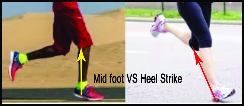 Many runners land heel first instead of landing on their forefoot or mid foot as our ancestors did. That is exactly what I was doing. It was causing excessive collision force on my heel and a lack of spring in my overextended stride. The result for me was a case of Plantar fasciitis and knee pain. In running, heel striking which usually goes along with over-striding, is like someone hitting you on the heel with a hammer two to three times your body weight. If you do this long enough it will wear on your joints. In the Gokhale Method we teach landing on a bent knee when walking to soften the impact when touching the ground. The landing knee in running should be bent for the same reason. I find this easier with a mid or forefoot landing.